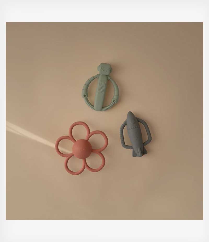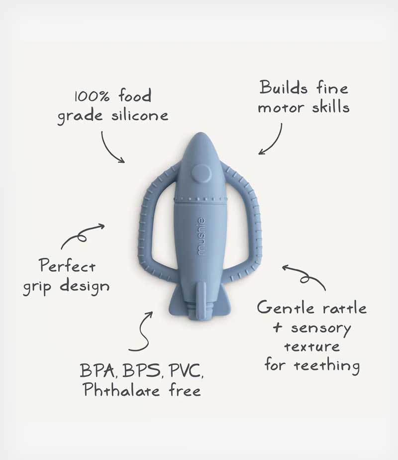 Εμπνευσμένο από το διάστημα και σχεδιασμένο με γνώμονα τη λειτουργικότητα και την άνεση, το μασητικό σιλικόνης Rocket Rattle Teether διαθέτει παιχνιδιάρικο σχήμα πυραύλου και ενσωματωμένη κουδουνίστρα. Ο χαρούμενος ήχος ενεργοποιεί τις ακουστικές αισθήσεις του μωρού για πρόσθετη καταπραϋντική ανακούφιση.