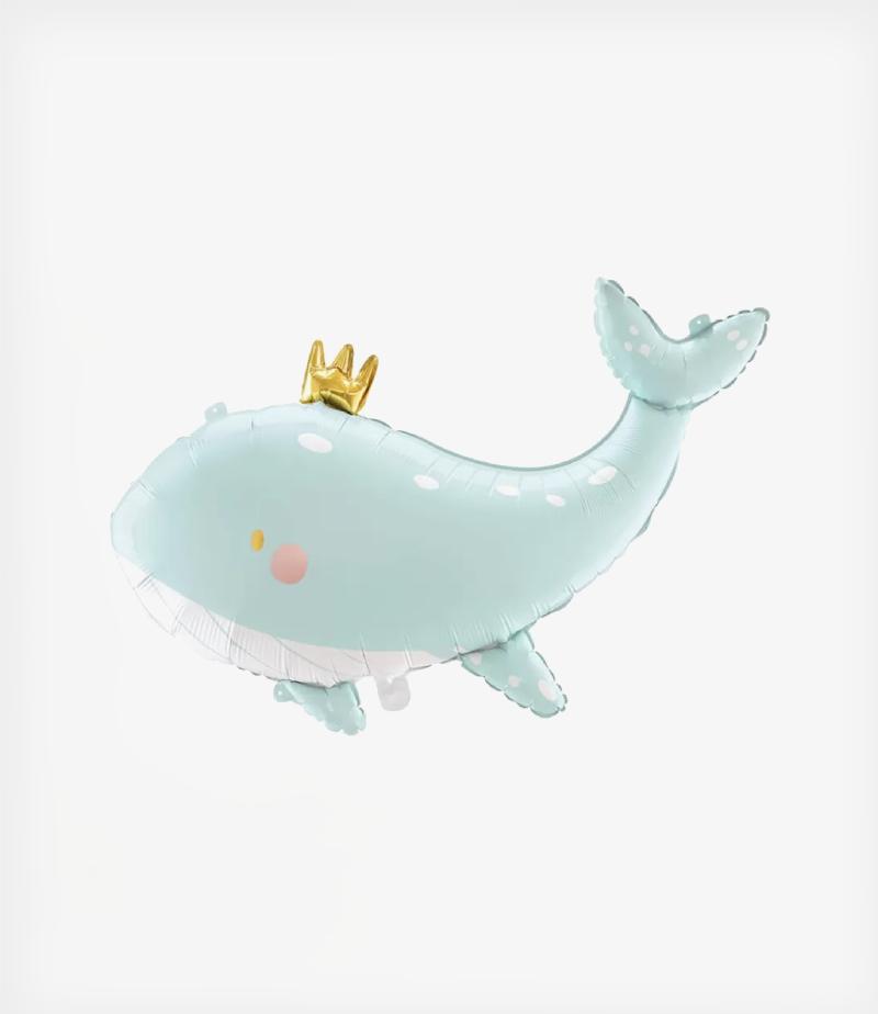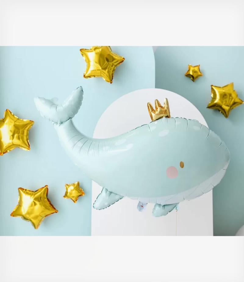 Μπαλόνι foil φάλαινα σιέλ με χρυσή κορώνα.