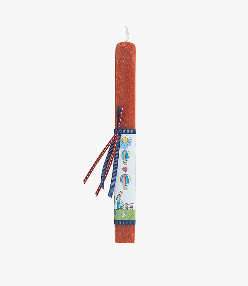 Πασχαλινή λαμπάδα σε πλακέ κόκκινο αρωματικό κερί με εκτυπώση το εικαστικό της.