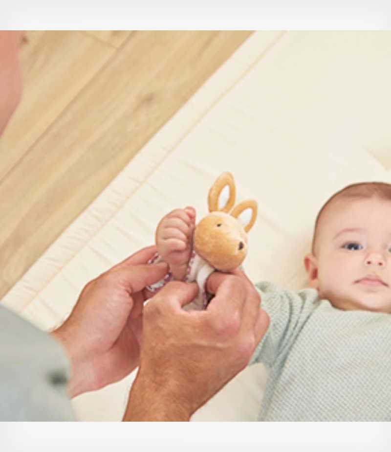 Το βραχιολάκι (κατάλληλο για ηλικίες 3-9 μηνών) διαθέτει ένα κουνελάκι με ενσωματωμένο κουδουνάκι, ενώ τα παπουτσάκια (12×4 εκ.) από κοτλέ ύφασμα είναι διακοσμημένα με υπέροχα κεντήματα εμπνευσμένα από το γνωστό νανούρισμα.