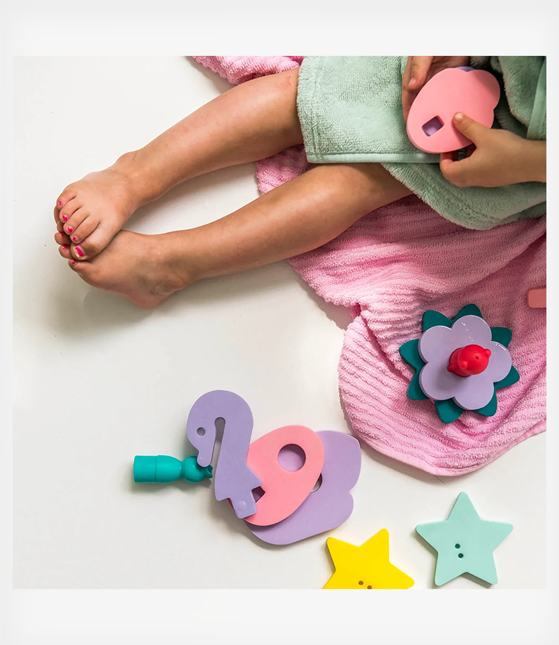 - Αποτελείται από 11 κομμάτια, κατασκευασμένα από αφρώδες υλικό που κολλάει στις επιφάνειες του μπάνιου όταν βρέχεται