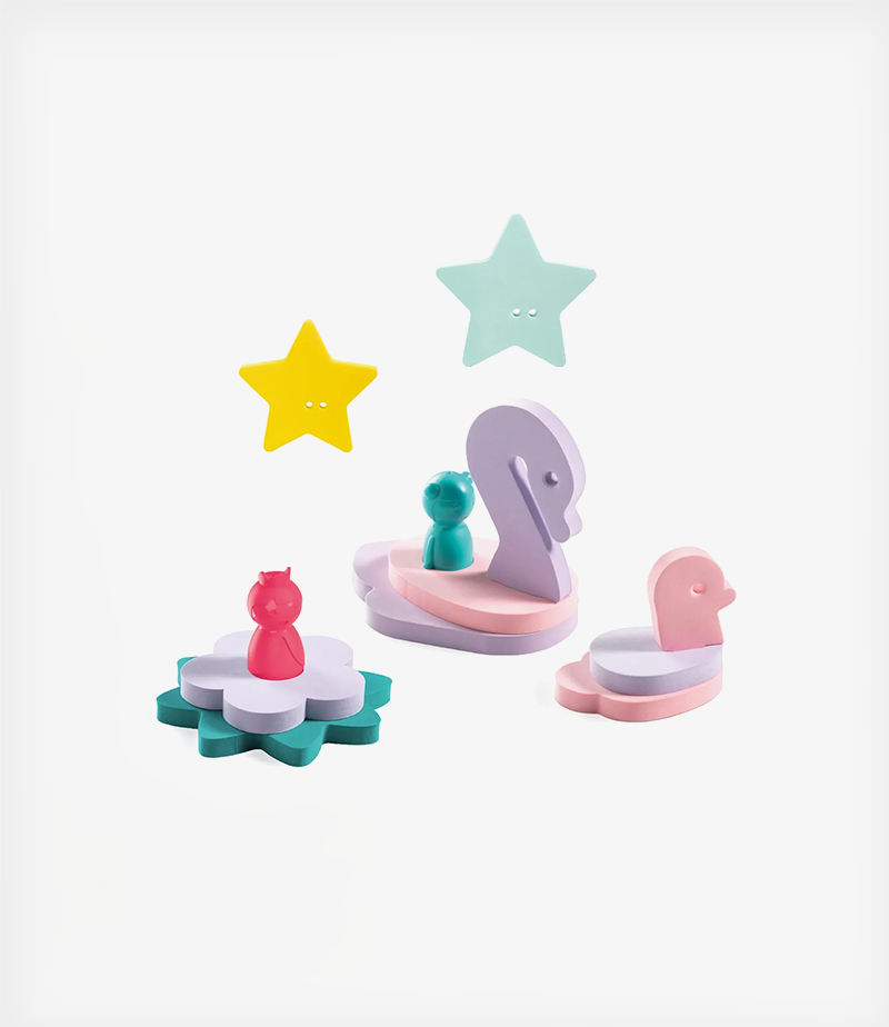 Όλα τα σχήματα είναι κατασκευασμένα από μαλακό αφρώδες υλικό EVA, το οποίο τα κρατάει στην επιφάνεια. Το σετ περιλαμβάνει επίσης 2 δακτυλοκουκλάκια.