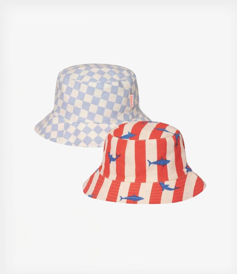 Πλήρως αναστρέψιμο με το όμορφο σχέδιο με καρχαρίες στη μία πλευρά και ένα απαλό, καρό σχέδιο στην άλλη. Με φαρδύ γείσο για επιπλέον σκιά, ένα απόλυτα πρακτικό καπέλο για περιπέτειες στον κήπο, στο πάρκο ή στις διακοπές!