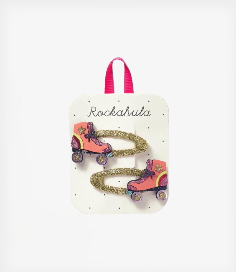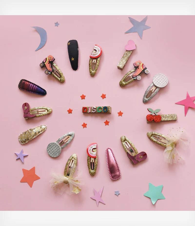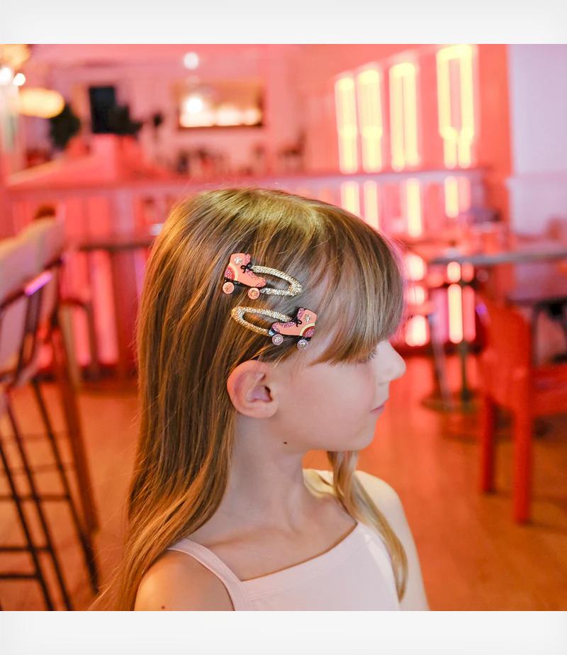 Άφησε τις καλές στιγμές να κυλήσουν… και να λάμψουν! Δύο εντυπωσιακά glitter πατίνια διακοσμούν κλιπ τύπου snap, τυλιγμένα με χρυσή κορδέλα.