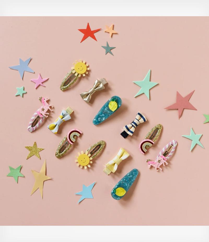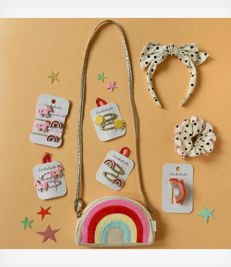 Κάθε πόνι είναι τοποθετημένο πάνω σε snap clips τυλιγμένα με φωτεινό ριγέ ύφασμα.
