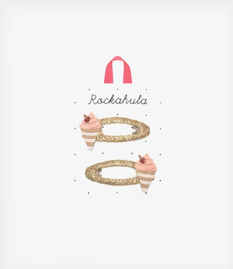 Βουτήξτε στην απόλαυση που προσφέρουν τα τα νόστιμα παγωτά μας με γεύση Very Cherry αυτή την εποχή! Δύο παγωτά σε χωνάκι με κεράσια στην κορυφή, τοποθετούνται πάνω σε δύο χρυσές κορδέλες που περιβάλλουν τα κλιπ μαλλιών.