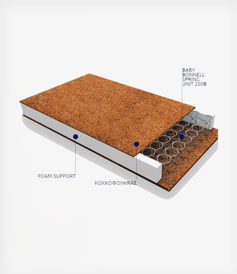Τα ελατήρια BABY BONNELL SPRING UNIT 200B προσφέρουν εξαιρετική αντοχή, ενώ η στρώση από κοκκοφοίνικα προσφέρει ελαστικότητα και επιτρέπει την κυκλοφορία του αέρα στο εσωτερικό του στρώματος. Επιπλέον, το αφρώδες υλικό ενισχυμένης πυκνότητας Foam support υποστηρίζει περιμετρικά το στρώμα.