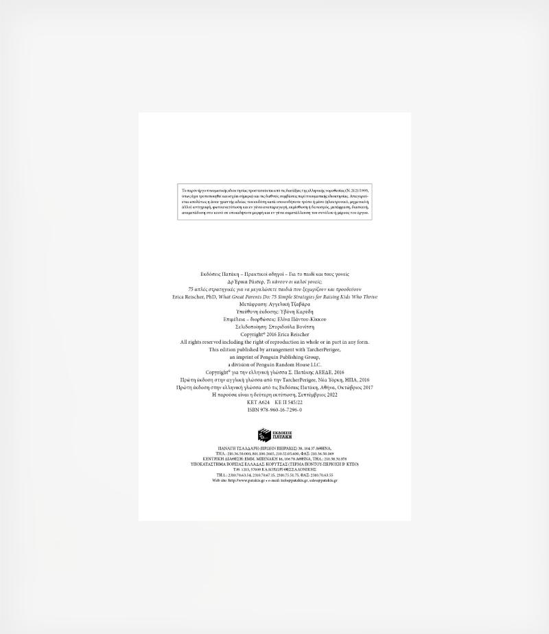 Το βιβλίο αυτό παρουσιάζει καίριες στρατηγικές που θα βοηθήσουν τους γονείς να αλλάξουν τις προκλητικές συμπεριφορές των παιδιών τους, να δημιουργήσουν ισχυρούς οικογενειακούς δεσμούς και να καθοδηγήσουν τα παιδιά τους ώστε να γίνουν ευτυχισμένοι, καλοί και υπεύθυνοι ενήλικες. Η ψυχολόγος Έρικα Ράισερ επιλέγει τις πιο χρήσιμες πληροφορίες για την τέχνη και την τεχνική της γονεϊκότητας που προέκυψαν από την έρευνα και την κλινική της εμπειρία και τις οργανώνει σε 75 συνοπτικά κεφάλαια με πραγματικά παραδείγματα, χρήσιμες ιδέες και εργαλεία που μπορούν να χρησιμοποιηθούν άμεσα από τους γονείς. Παρουσιάζονται επίσης τεχνικές που η συγγραφέας διδάσκει σε εργαστήρια για γονείς, και το πώς αυτές συνδυάζονται αποτελεσματικά. Τελικά, μέσα από αυτό το βιβλίο θα μάθετε αυτά που κάνουν οι καλοί γονείς, όπως ότι:
