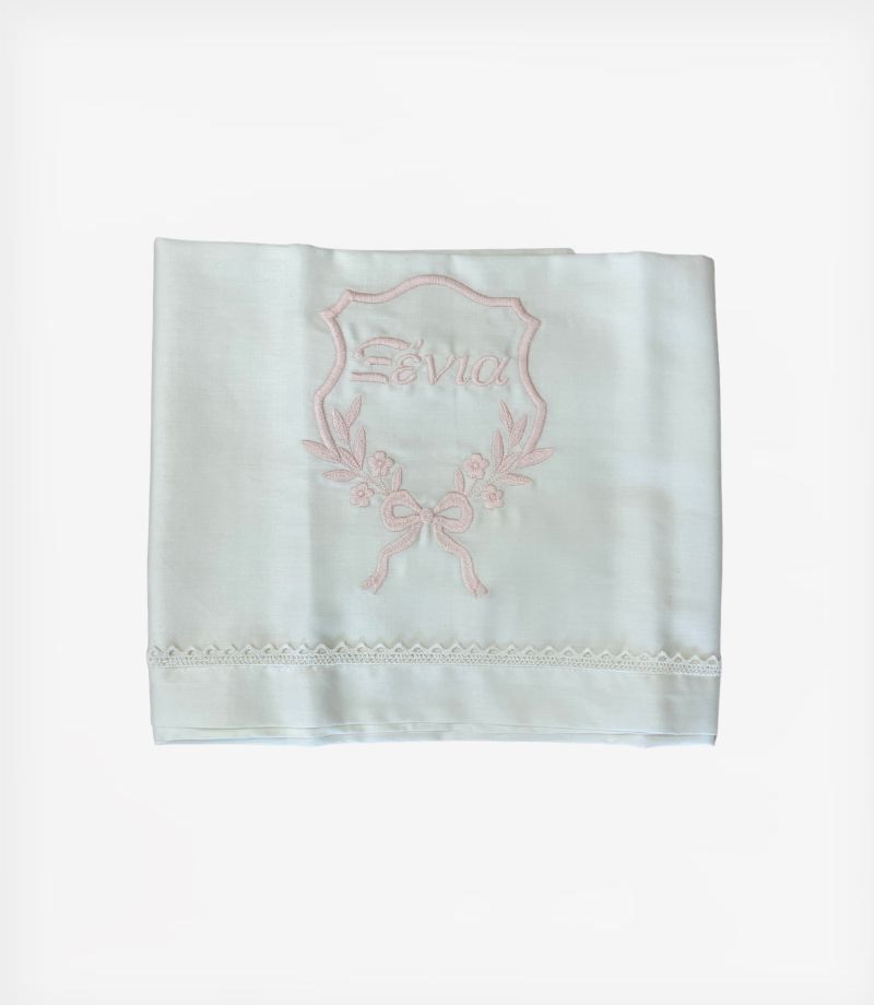 Σε σεντόνια λίκνου με δυνατότητα προσωποποίησης με το όνομα του μωρού από υψηλής ποιότητας βαμβακοσατέν ύφασμα, απαλό και φιλικό προς την ευαίσθητη επιδερμίδα του μωρού.