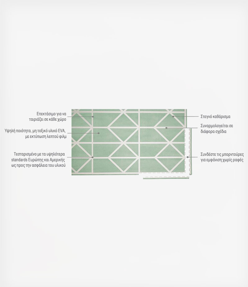 Υψηλή ποιότητα, μη τοξικό υλικό EVA , με εκτύπωση λεπτού φιλμ. Τόσο το υλικό όσο και η εκτύπωση έχουν τεσταριστεί με τα υψηλότερα standards Ευρώπης και Αμερικής ως προς την ασφάλεια των υλικού. Χωρίς φορμαλδεϋδη, χωρίς βαρέα μέταλα, χωρίς φθαλικά. Με πιστοποίηση CE.