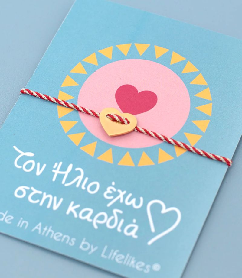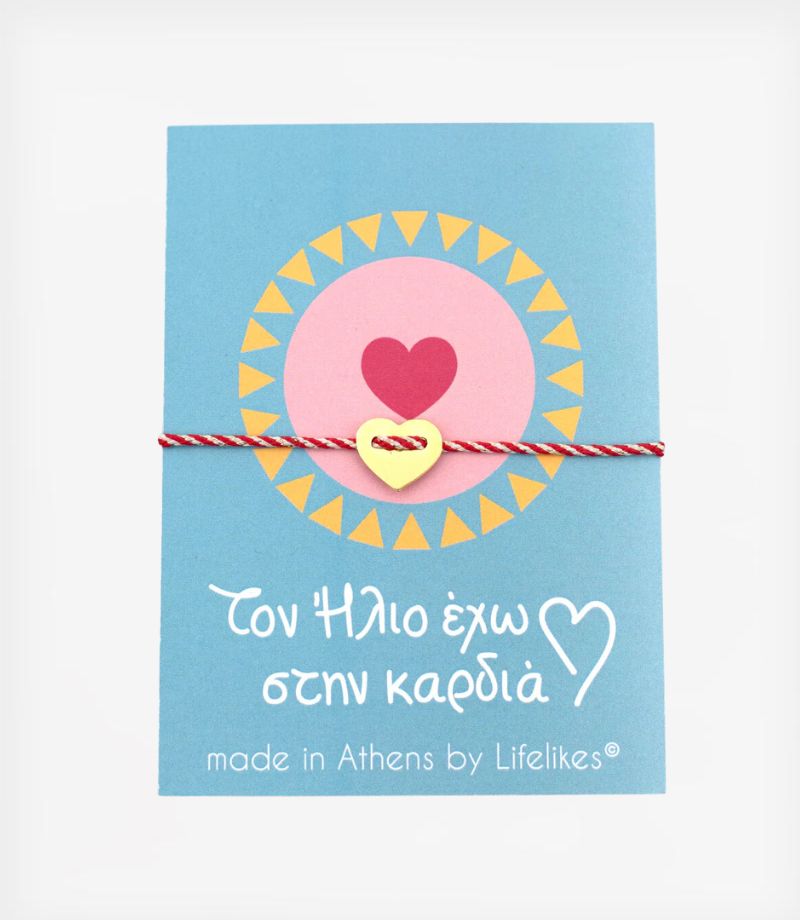 Ένα μαρτάκι γεμάτο θετική ενέργεια και αγάπη! Το κλασικό κόκκινο-λευκό κορδόνι στολίζεται με μια χρυσή μεταλλική καρδιά, συμβολίζοντας τη ζεστασιά, τη χαρά και τη δύναμη της αγάπης. Μια υπέροχη επιλογή για να καλωσορίσετε την άνοιξη με χαμόγελο! Φορέστε το μαρτάκι σας από την 1η Μαρτίου και κρατήστε την παράδοση ζωντανή, αφήνοντάς το στον ήλιο στο τέλος του μήνα!