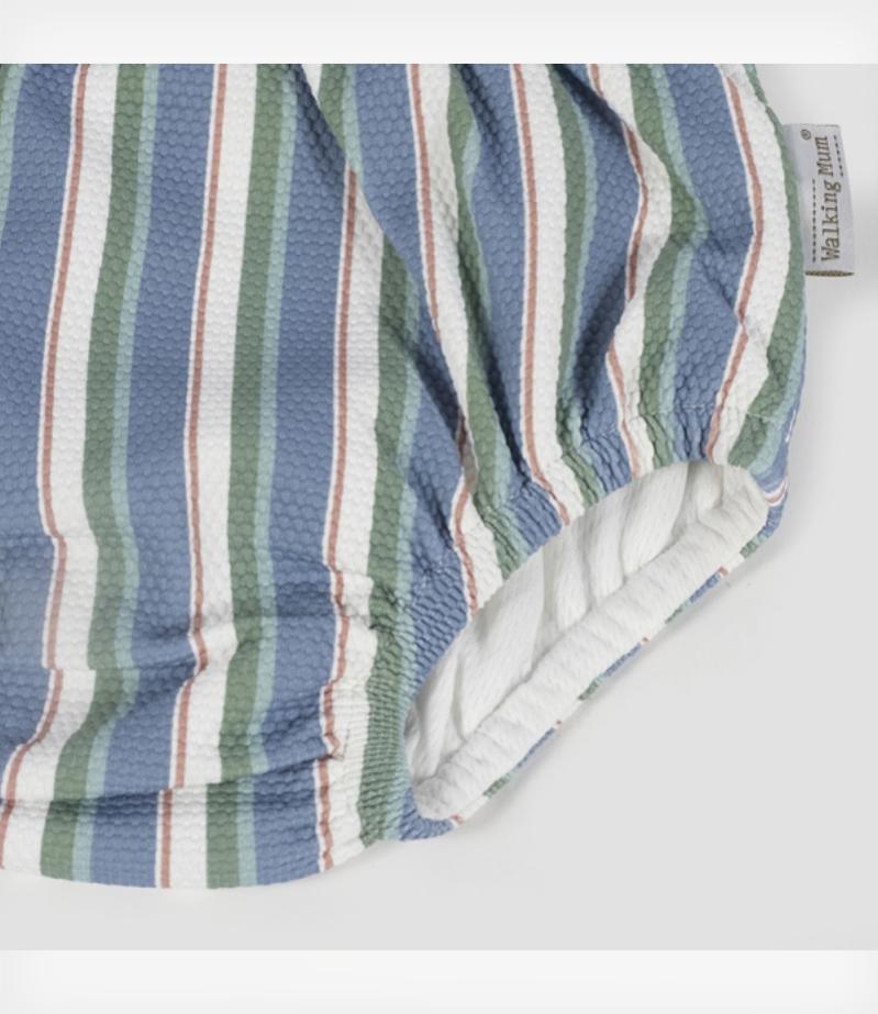 Ετοιμάστε το μωρό σας για τις πρώτες του βουτιές με το μαγιό πάνα Strips της Walking Mum! Αυτό το μαγιό συνδυάζει το ριγέ διαχρονικό σχέδιο με τη μέγιστη λειτουργικότητα και ασφάλεια. Χάρη στην αντιηλιακή προστασία SPF 50+, το ευαίσθητο δέρμα του μωρού σας θα είναι προστατευμένο από τις υπεριώδεις ακτίνες, ενώ εκείνο απολαμβάνει το νερό στην παραλία ή την πισίνα.