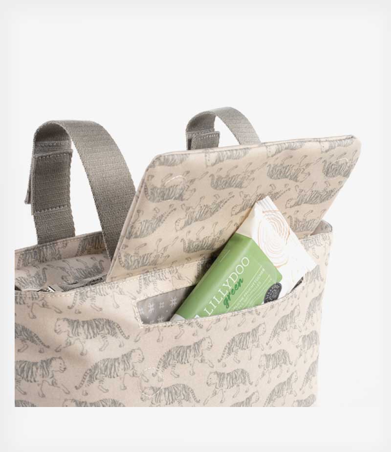 Με μεγάλη χωρητικότητα και εσωτερική επένδυση με τσέπες θα μεταφέρετε άνετα όλα όσα χρειάζεται το μωρό σας. Διαθέτει ακόμα μία εσωτερική τσέπη για βρεγμένα ρούχα που δεν επιτρέπει να περάσεις η υγρασία στα υπόλοιπα περιεχόμενα της τσάντας. Κατασκευασμένη από οικολογικό αδιάβροχο βαμβάκι.